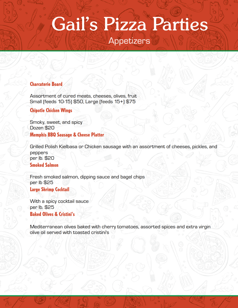 Pizza Menu: all pies $33, G.F. $25 (6 pie minimum, 15 Pie maximum)