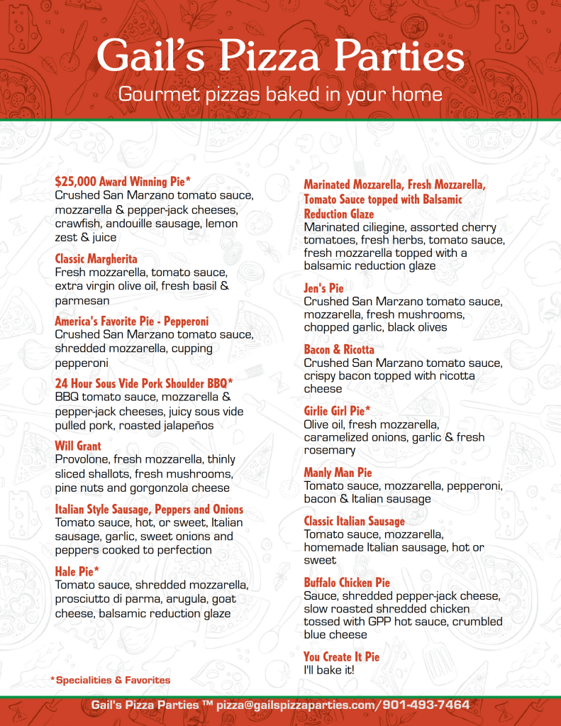 I provide all the ingredients needed for your parties. All my pies are made with hand crushed San Marzano tomato sauce and the freshest herbs and spices!